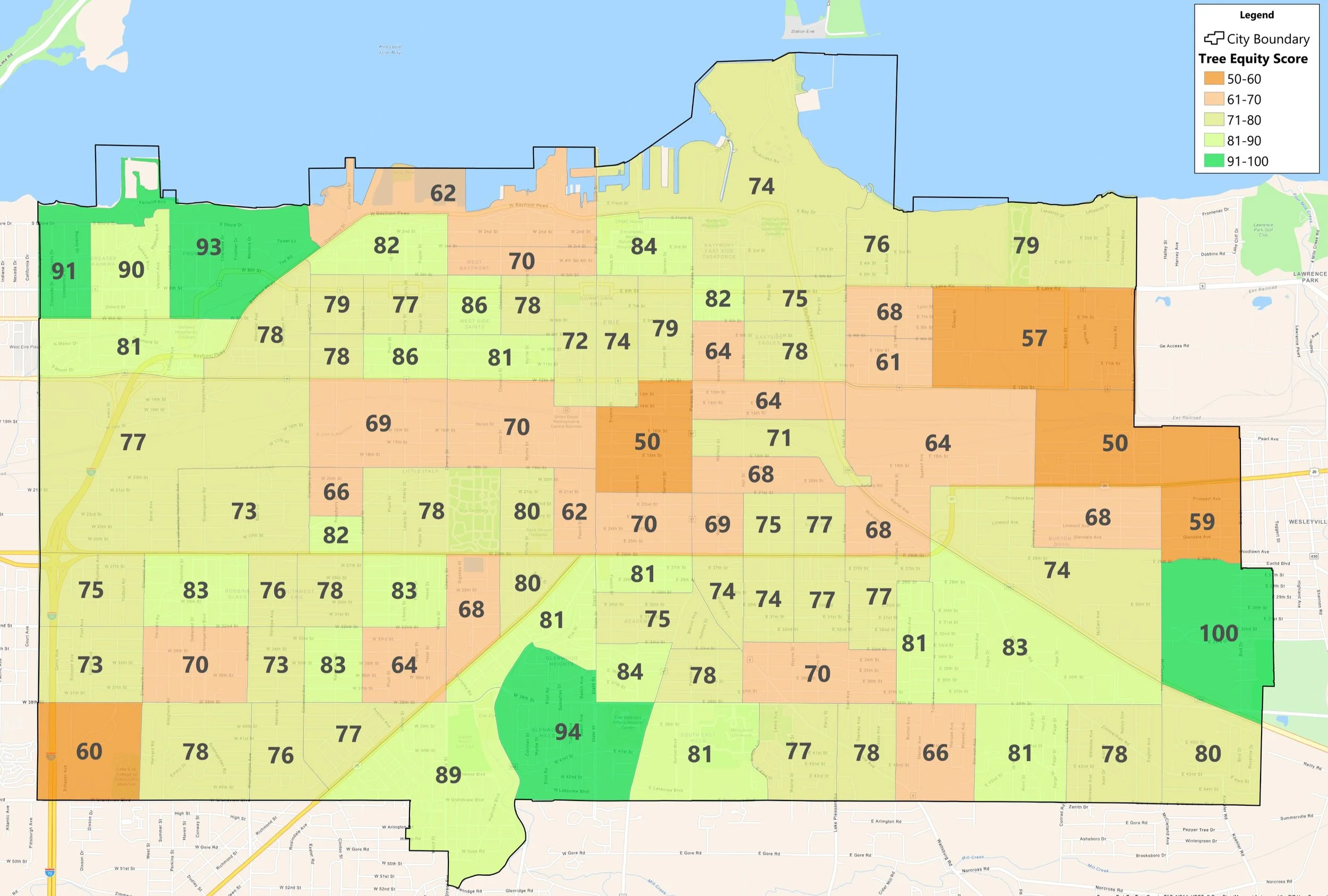 The map pictured here (compiled by the City of Erie Planning Department with data from American Forests) is a tool that assigns a number from 0 to 100 to Census block groups.